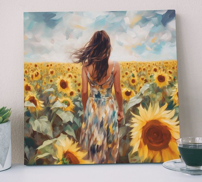 Картина "Девушка и подсолнухи" на деревянном подрамнике  40х40 см