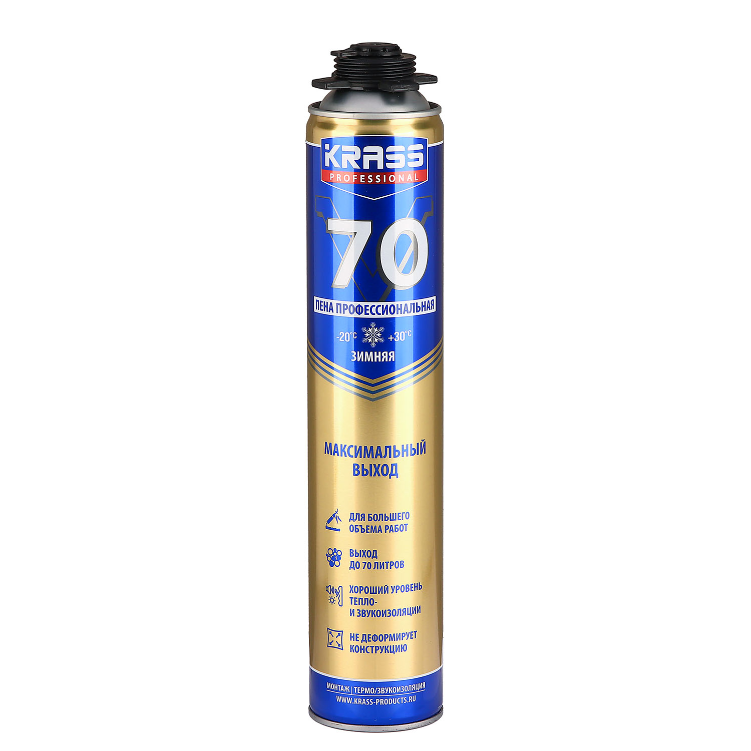 штПена монтажная KRASS Professional V70 зимняя — профессиональная однокомпонентная полиуретановая пена быстрого затвердевания под воздействием влажности воздуха. Обновленная рецептура обеспечивает стабильный равномерный выход пены до 70 литров и низкое вторичное расширение.