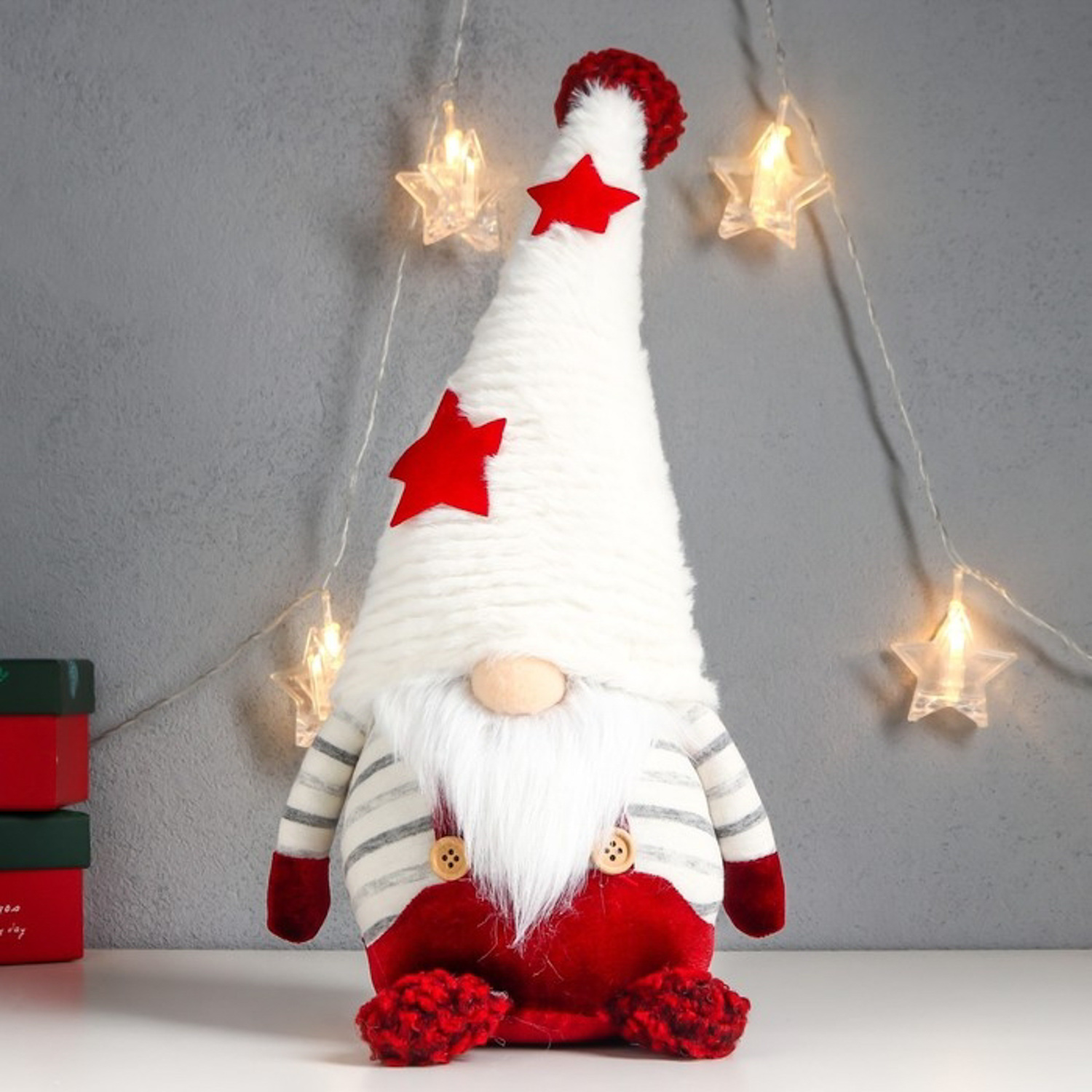 Кукла интерьерная "Дед Мороз в красном комбинезоне, в колпаке со звёздами" 35х16х14 см