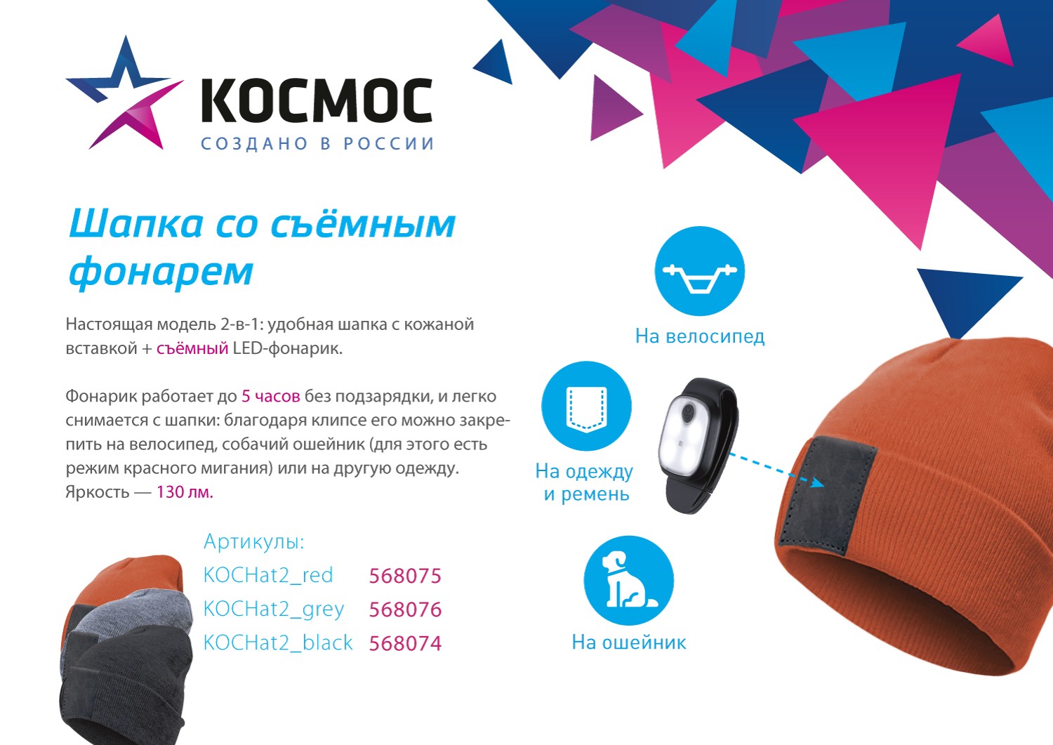 яяяШапка с фонариком серая (фонарь снимается 3,7В/300мА.ч 3реж) Космос 215*205*5 KOCHat2 grey *1/50