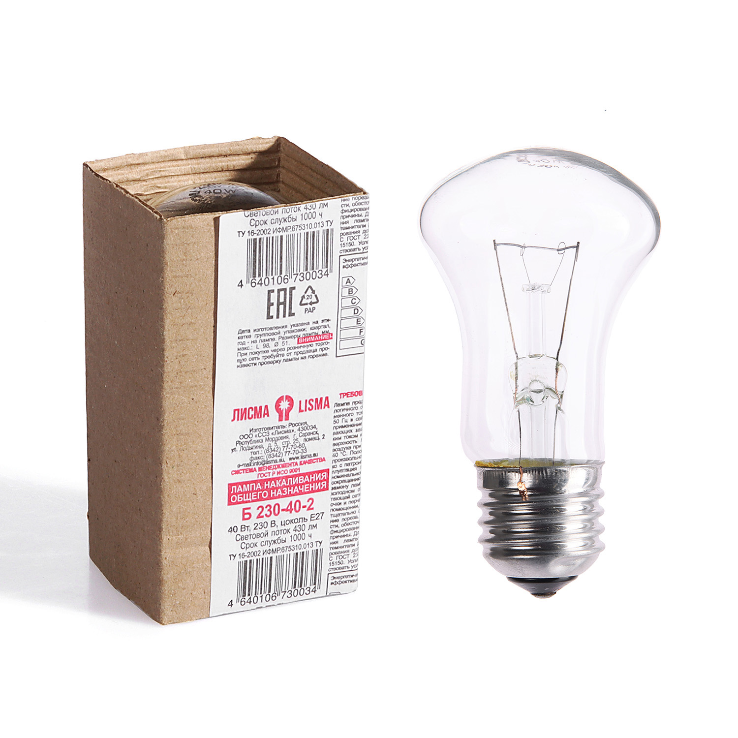 Лампа накаливания Лисма, Е27, груша, 40 Вт, 430 Лм, теплый белый свет