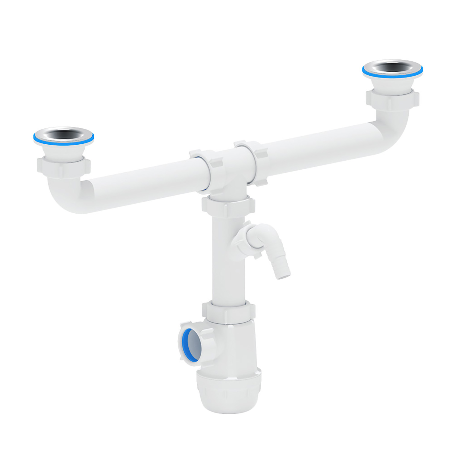 Сифон для кухонной мойки с двумя чашами и сливными отверстиями 50 мм. Выход для подключения к канализации 40 мм.