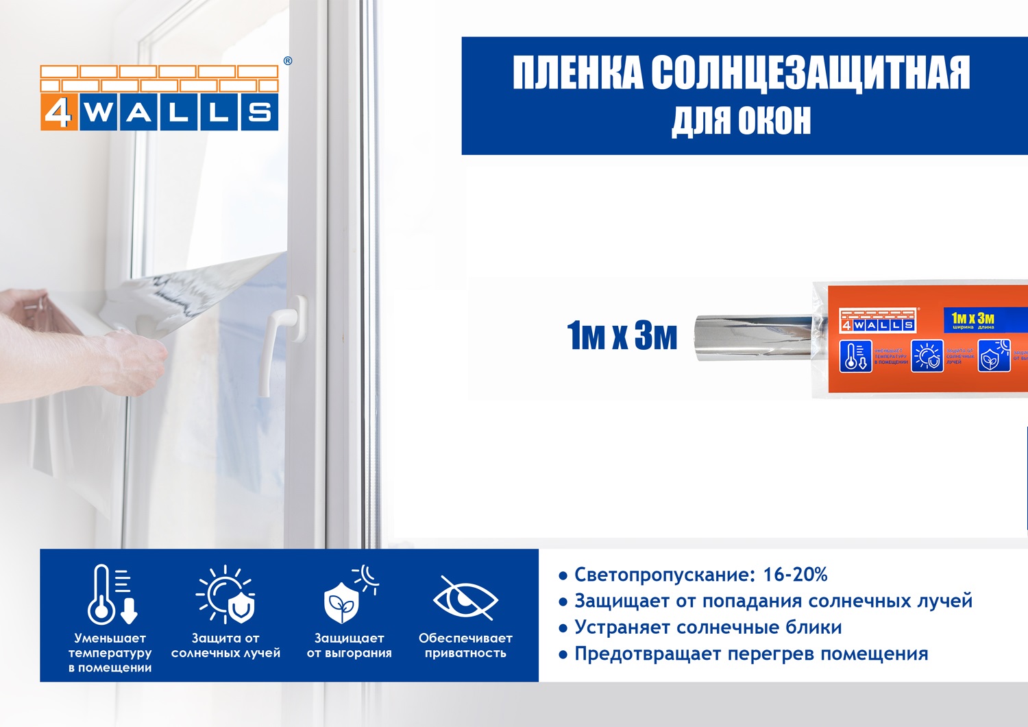 Пленка 1х3 м солнцезащитная 4Walls, для окон