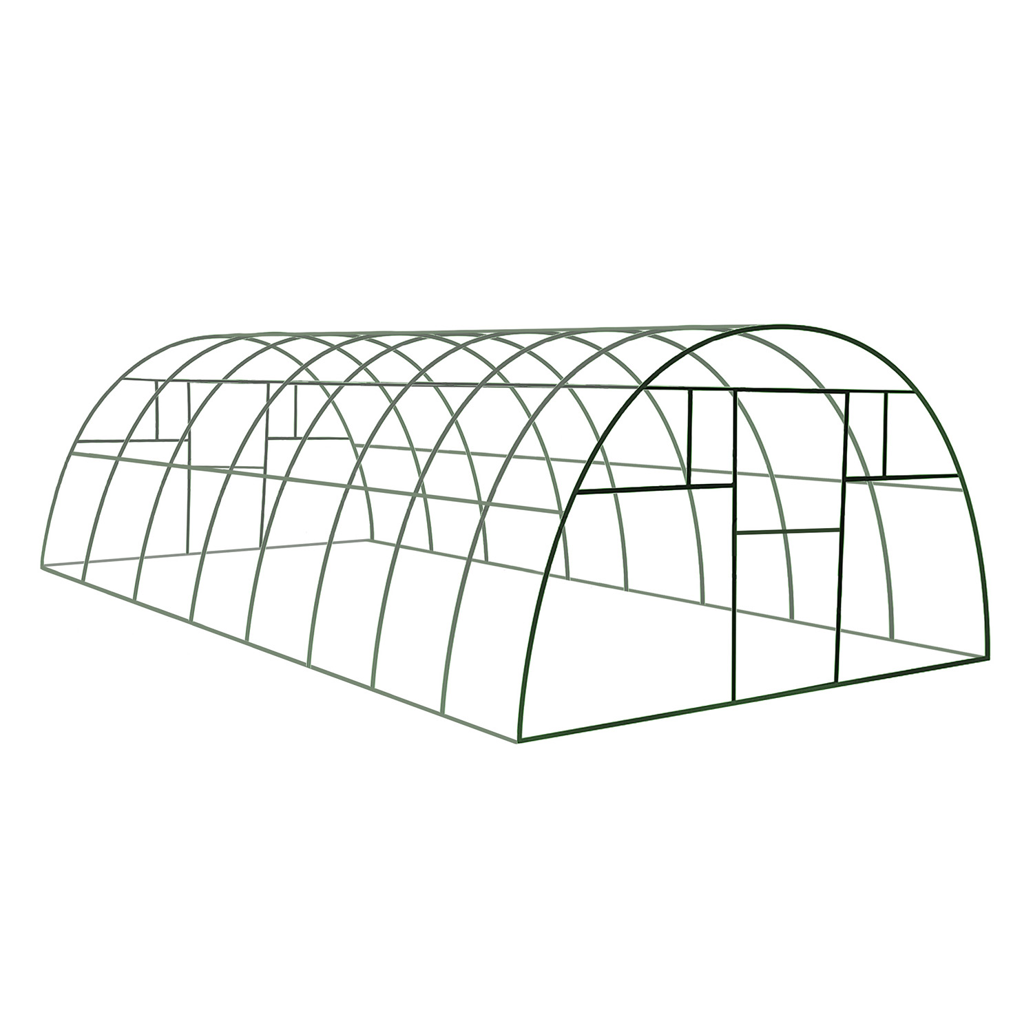 Каркасы легко трансформируются, что позволяет изменить размеры полезной площади. Конструкцию можно применять при строительстве сборно-разборных сезонных теплиц и в качестве капитального сооружения. В каркасе предусмотрены двери и форточки, расположенные с обеих торцевых сторон.