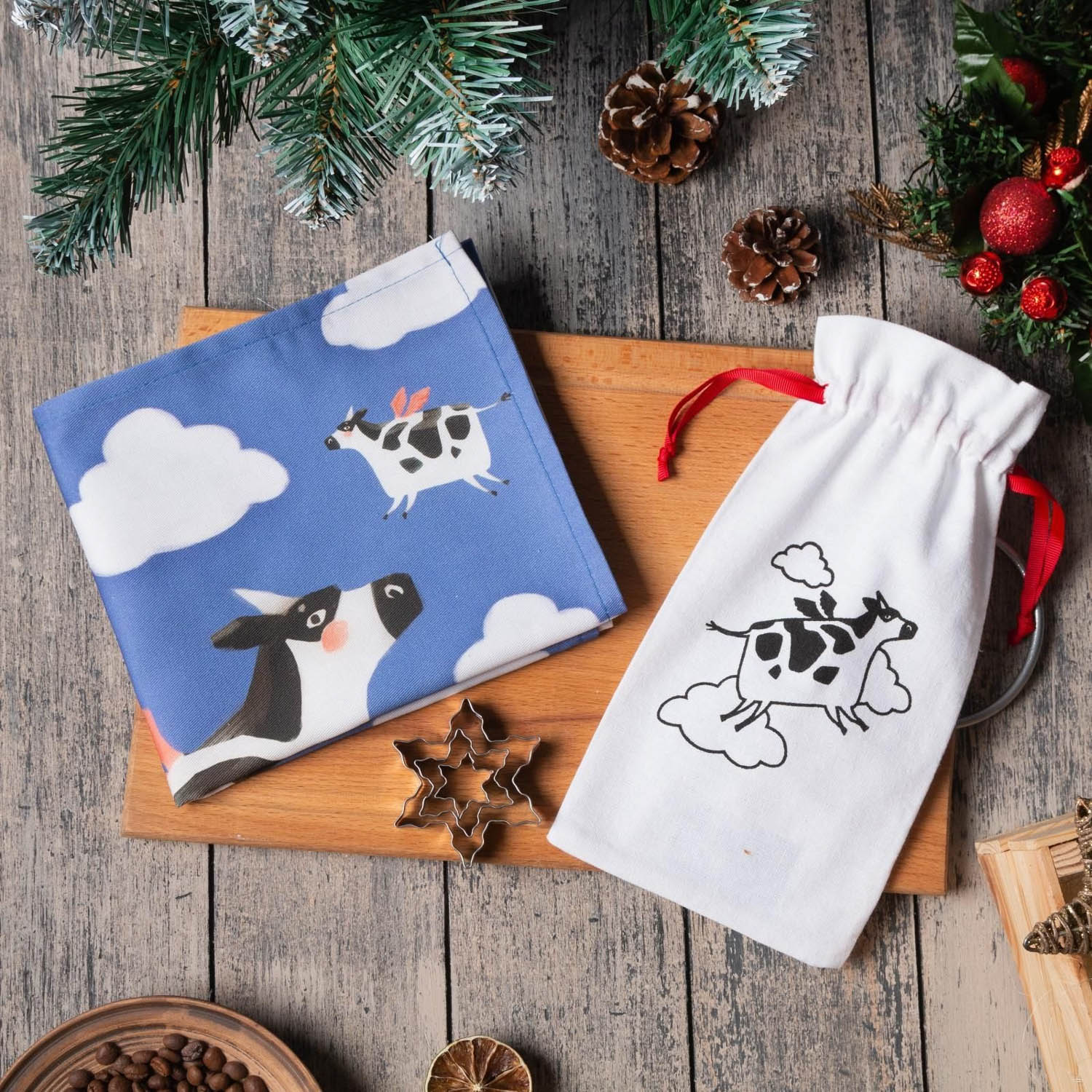 яяяНабор в мешочке "Летающие коровки" полотенце 40х73см, формочки для запекания 3 шт 5081038