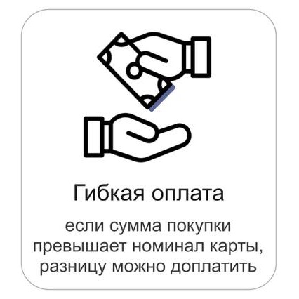 • Если сумма покупки превышает номинал карты, то необходимую сумму можно доплатить банковской картой или наличными