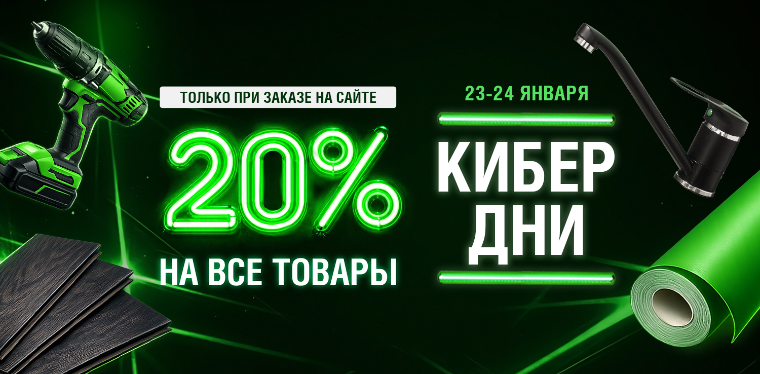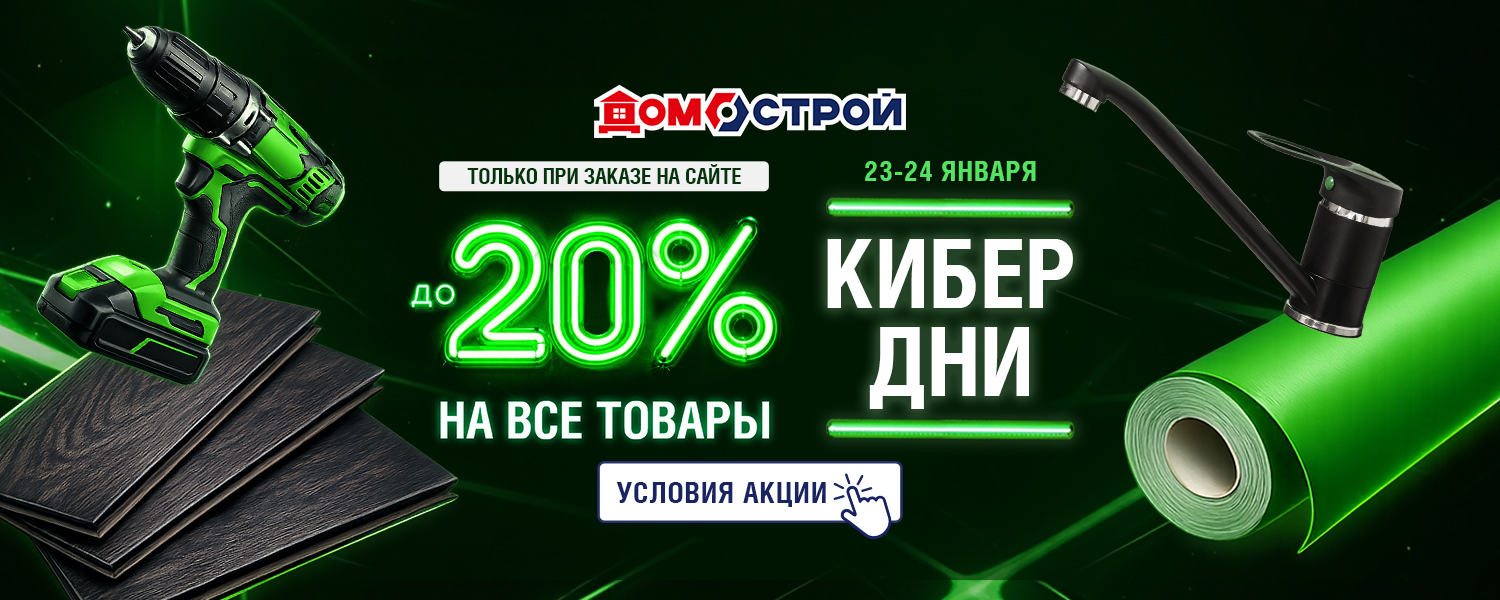 КИБЕРдни в сети ДомоСтрой! Только 2 дня — 23 и 24 января при заказе на сайте скидка -20% на огромный ассортимент товаров. Это отличная возможность приобрести напольные покрытия, обои, люстры, инструменты, двери, товары для дома и многое другое по привлекательным ценам! Оформляйте заказы в дни акции со скидкой и забирайте в течение 3 дней после.