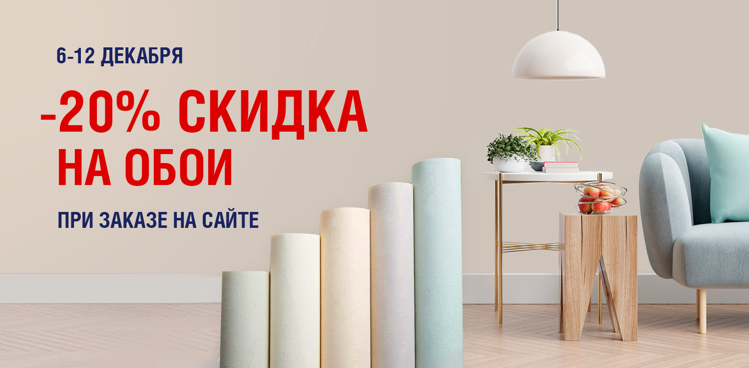 Успейте воспользоваться скидкой 20% на обои с 6 по 12 декабря при оформлении заказа на сайте! Все товары, участвующие в акции, отмечены на сайте шильдиком «РАСПРОДАЖА». Цены на товарах указаны уже с учетом скидки. Так что, если у вас запланирован ремонт -  не упустите возможность купить обои со скидкой!
